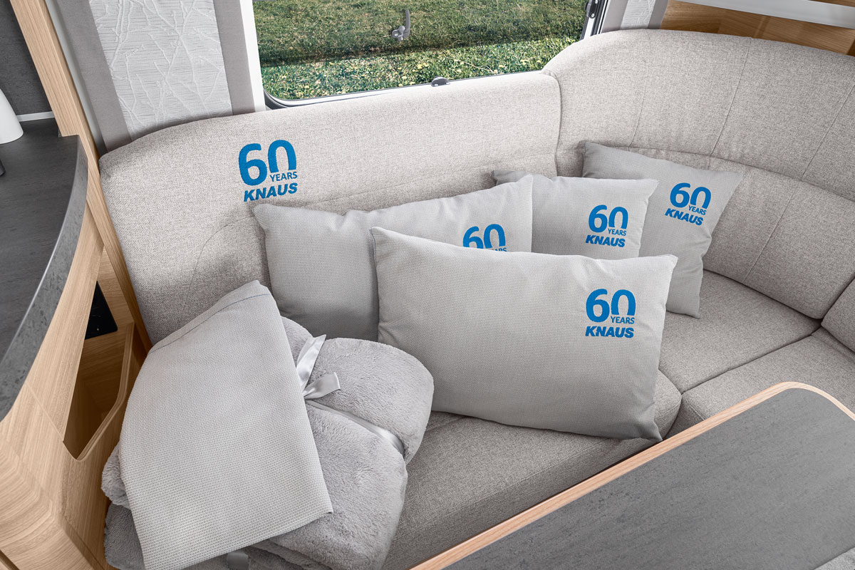 Das Jubiläumsmodell Knaus Südwind 60 Jahre verfügt über Polster mit 60 Years-Stickerei. Im Exterieur ziert der 60 Years-Aufkleber die glatte Seitenwand mit einer Beklebung im Stil der ersten Südwind-Wohnwagen. Leichtmetallfelgen, Stützlastanzeige, Multimedia-System, eine breite Aufbautür mit Insektenschutztür, Rollbettfunktion für Einzelbetten, Gasregler mit Gasfilter, Rauchmelder, Wasserfiltersystem, Außensteckdose für TV, TV-Halter, mehr Licht und Steckdosen sind außerdem an Bord.