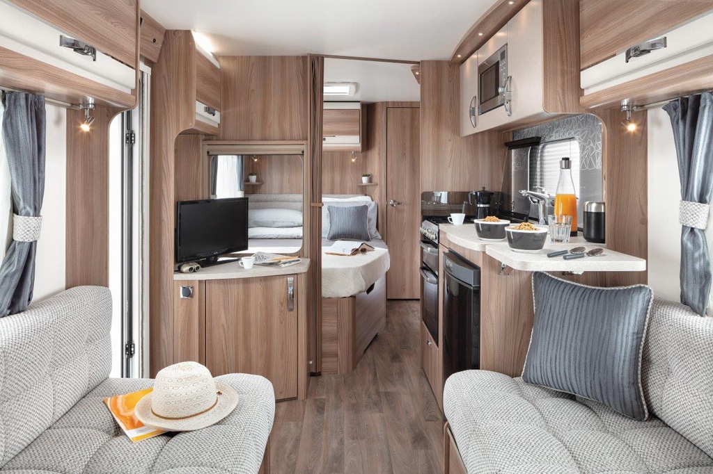 Auch in der kommenden Saison wird es auf dem Kontinent Wohnwagen von Sprite in vier Baureihen geben – aber in neuem Design und mit neuen Grundrissen. So bekommt der Sportcaravan Basecamp eine größere Version, die Basecamp 4 heißt. Er wird sportlicher im Design und die Hecktür bekommt ein Fenster. Der Neue ist 49 Zentimeter länger als bisher, sodass eine zusätzliche Sitzecke reinpasst. Diese kann in ein Etagenbett umgebaut werden, wodurch bis zu vier Personen Platz finden. Konsequenterweise wird der bekannte Basecamp zukünftig Basecamp 2 heißen.