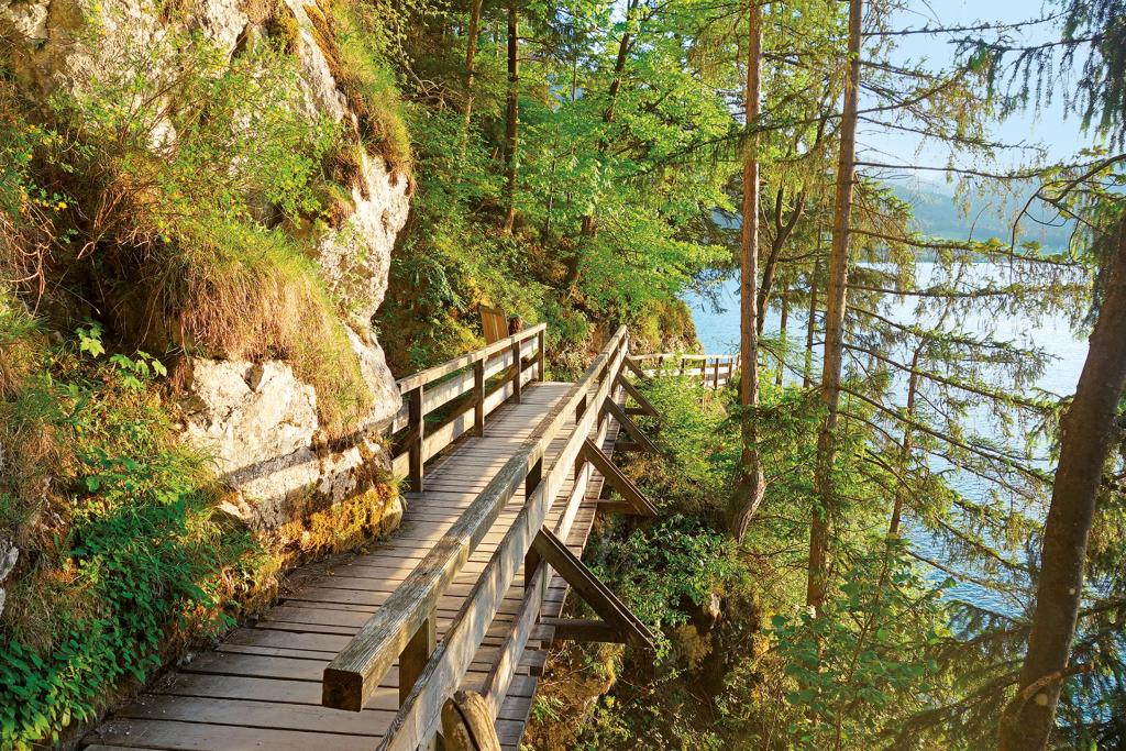 Der Ort liegt tatsächlich besonders schön – ruhig, abseits der Seestraße, mit einem traumhaften Blick auf Berge und See. Außerdem gibt’s gute Gaststätten, um einen fangfrischen Saibling oder die berühmte Reinanke zu essen. Vom Camping Berau kann man auf dem Bürgelstein-Panoramaweg einen Spaziergang nach Strobl unternehmen, auf Holzstegen, die übers Wasser führen.