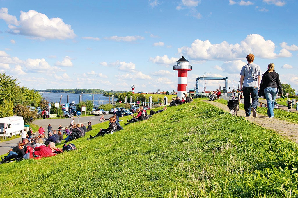 Auf der Elbe ist immer Showtime. 40.000 Schiffe steuern jährlich den Hamburger Hafen an und passieren dabei auch das Alte Land. Am Lüheanleger und in Stadersand hat man sie alle im Blick – die Containerriesen, die Kreuzfahrtflotte und die Segelboote, die angesichts der dicken Pötte winzig klein daherkommen. Besonders entspannt lässt sich das Ganze aus der liegenden Position betrachten, etwa am langen Sandstrand in Bassenfleth oder am Krautsand-Strand – ein Urlaubsgefühl wie an der Nordsee, obwohl es bis dort noch ein paar Seemeilen sind. Baden ist an der Elbe offiziell erlaubt, manche Strände, etwa in Lühe, werden auch von der DLRG überwacht. Dennoch wird immer wieder davor gewarnt, zu weit raus zu schwimmen.