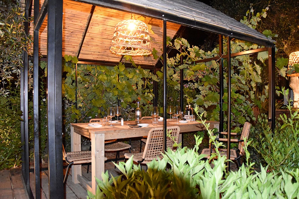 Wir beziehen unsere großzügige Parzelle, gesäumt von blühenden Sträuchern mit eigenem Wasseranschluss und sind anschließend gleich mal überrascht vom Speisenangebot im oberhalb gelegenen Restaurant mit lauter kleinen Lauben im Freien. Bunte Lämpchen baumeln von den Pergolen und hängen in Büschen und Bäumen. Ist das schon Glamping?