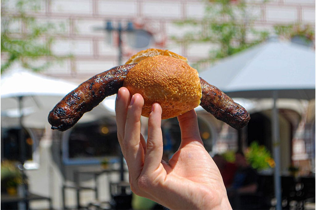 Doch der Marktplatz bietet Besuchern nicht nur Schönes fürs Auge, er hält auch für den Gaumen Gutes bereit. Die Coburger Bratwurst ist ein Hochgenuss, schließlich nehmen es die Coburger mit der Rezeptur sehr genau, sogar die Länge der weißen Wurst ist vorgeschrieben. Tipp: Wer wissen möchte, wie viele Zentimeter das sind, der sollte auf dem Giebel des Rathauses nachschauen. Dort steht das „Bratwurstmännle“. Es hält in seiner rechten Hand einen Marschall-Stab, das offizielle Bratwurstmaß.