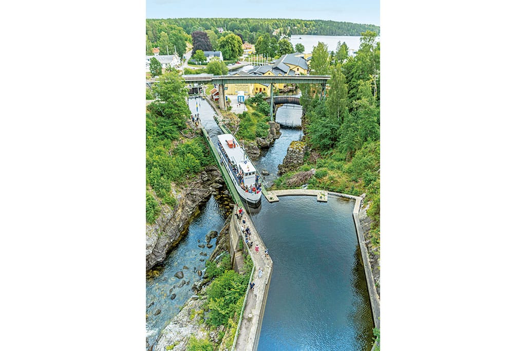 Auf Natur folgt Industriekultur. Rund 25 Kilometer südöstlich befindet sich das Aquädukt von Haverud, unweit des großen Vänern-Sees. Das spektakuläre Bauwerk ist Teil des vor mehr als 150 Jahren gebauten Dalsland-Kanals, der einst für den Transport von Eisenerz gebaut wurde. Der Fluss fließt hier mit starker Strömung und an steilen Felswänden entlang. Um Schiffen eine sichere Passage zu ermöglichen, ersannen Ingenieure eine wasserführende Brücke aus Stahl, gefolgt von einer Schleuse, um den Höhenunterschied zum folgenden See zu überwinden. Beeindruckend: Eine Eisenbahn- und eine Straßenbrücke führen über das Aquädukt. Laut den Betreibern ist es die einzige Stelle in Europa, an der sich Straße, Eisenbahn und Wasserweg kreuzen.
