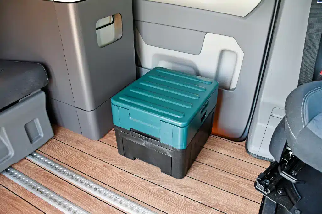 Das Gehäuse rechteckig mit abgerundeten Ecken, der Unterteil in Schwarz-matt und darüber der Aufsatz mit Toilettensitz und Deckel in dunklem Grün: Bei den Grundmaßen orientiert sich Clesana an der beliebten Porta Potti und misst 30 Zentimeter hoch, 34 breit und 38 Zentimeter tief. Das Herzstück der Clesana-Toiletten ist die patentierte Verschweiß-Einheit. Die stammt ursprünglich aus dem medizinischen Bereich und wurde 2018 von dem Innovations-Team der Erwin Hymer Group für die Caravaning-Szene entdeckt. Clesana wurde Teil der EHG und ist bis heute in Besitz der Familie Hymer.