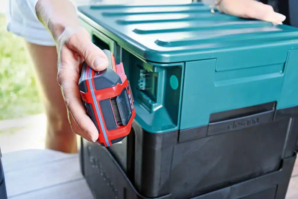 Zum Gebrauch der tragbaren X1 wird zunächst, vorn links, der Akku eingesteckt: ein 18-Volt-Werkzeugakku von Einhell. Die gibt es in der Sealed-Variante auch wasserdicht und staubgeschützt. Alternativ kann die X1 mit einem Netzteil über das 230-Volt-Netz des Campers betrieben werden.