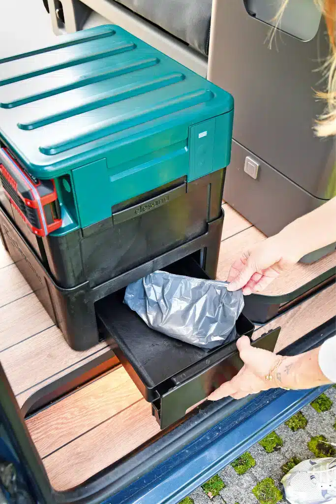 Fertig: Das Päckchen fällt ins Schubfach und kann nun entsorgt werden. Auch hier wurde mitgedacht: Die Schublade lässt sich nur im Teleskop-Modus öffnen. Bei Transport und Fahrt bleiben die Beutel somit sicher verstaut.