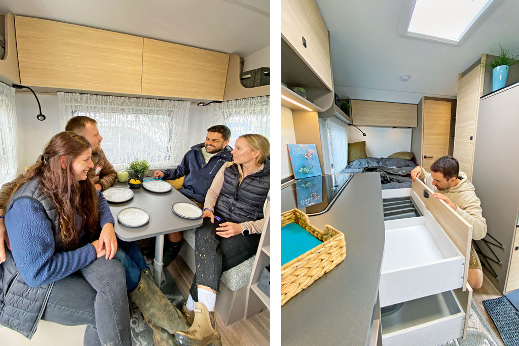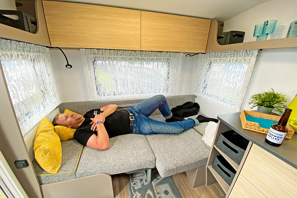Und warum? Er bietet ausreichend Platz für zwei Personen oder auch eine dreiköpfige Familie. Besonders gefällt ihm die durchdachte Raumaufteilung – trotz der kompakten Maße entsteht innen ein angenehmes Raumgefühl. „Wie viel Platz man innen hat, sieht man dem Caravan von außen gar nicht an“, meint Daniel. Dass auf großes Chichi bei der Ausstattung verzichtet wurde, empfindet er als zeitgemäß: „Oft will doch gerade meine Generation einfach weniger. Das spiegelt den Nerv der Zeit wirklich gut wider.“