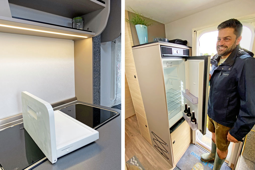 Für die richtige Stimmung sorgen dimmbare LED-Leseleuchten mit USB-C-Anschluss. Schmankerl lassen sich auf dem funktionalen 2-Flammen-Gasherd zubereiten und die geräumige Besteckschublade bietet ausreichend Platz für allerlei Küchenwerkzeug. Die Küche hat es den drei Schwaben übrigens besonders angetan.