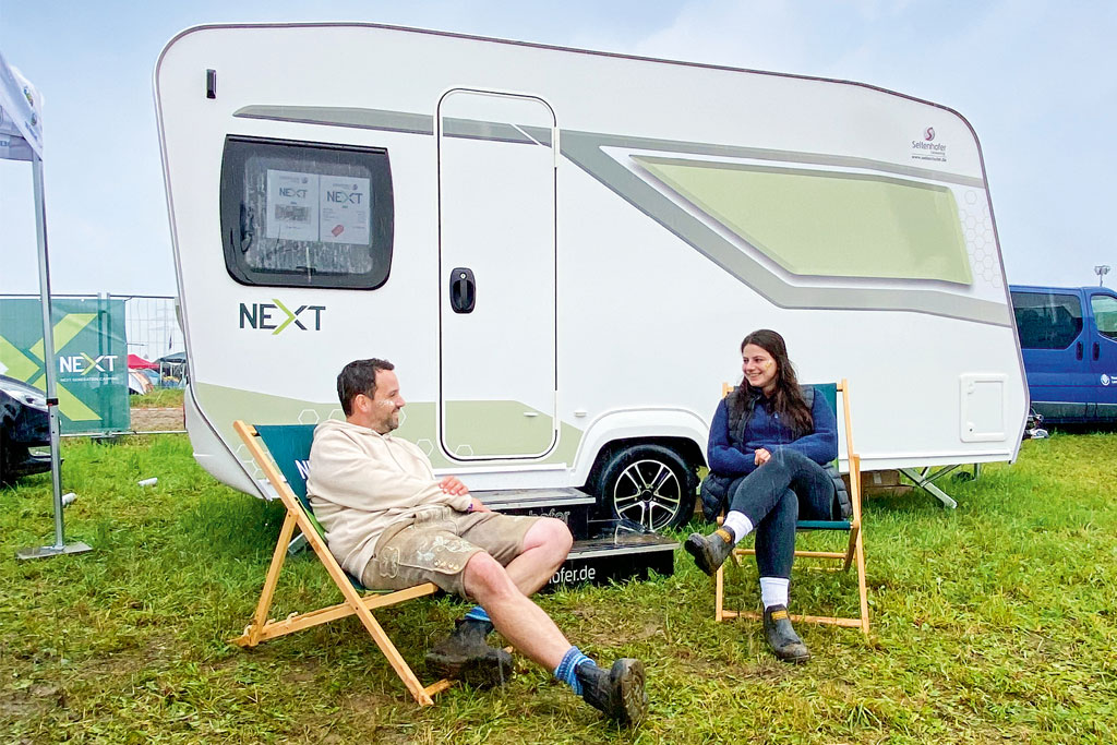 Kaum zu übersehen zwischen all den nassgeregneten Zelten und den zusammengeschusterten Containerburgen stand inmitten der riesigen Camper-Area der kompakte Next 380. Auf den ersten Blick ein starker Kontrast. Und dennoch zeigte sich: Der auf das Wesentliche reduzierte Leichtbauwohnwagen, den Fendt-Caravan seit März 2025 im Sortiment führt, soll nicht nur zum Lebensgefühl der jungen Generation passen, sondern sich auch unkompliziert an jedes Setting anpassen können. Ganz gleich ob Strandurlaub, Städtetrip oder uriges Open-Air-Festival. Nicht nur durch sein kompaktes Maß und seine einfache Handhabung fügte er sich so in die Festivalszenerie bestens ein.