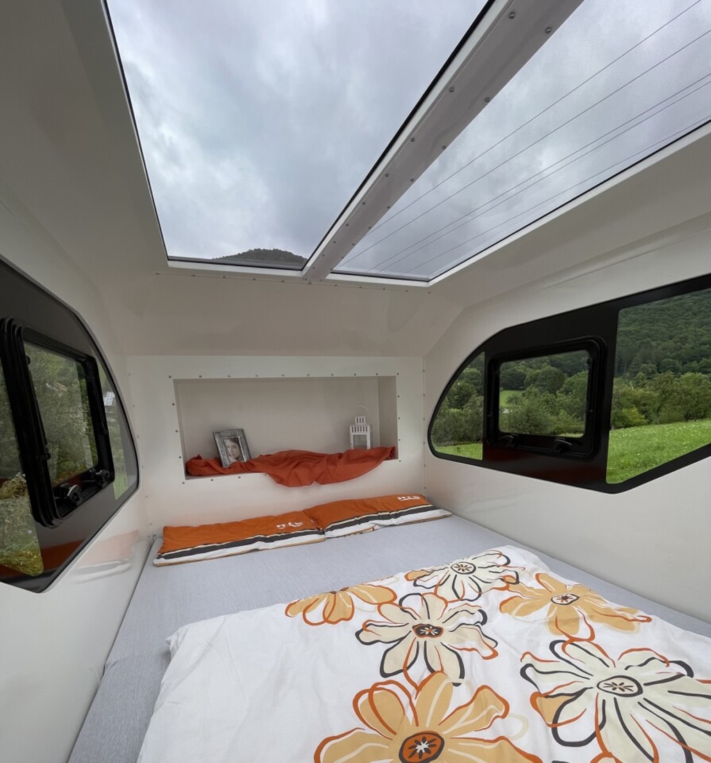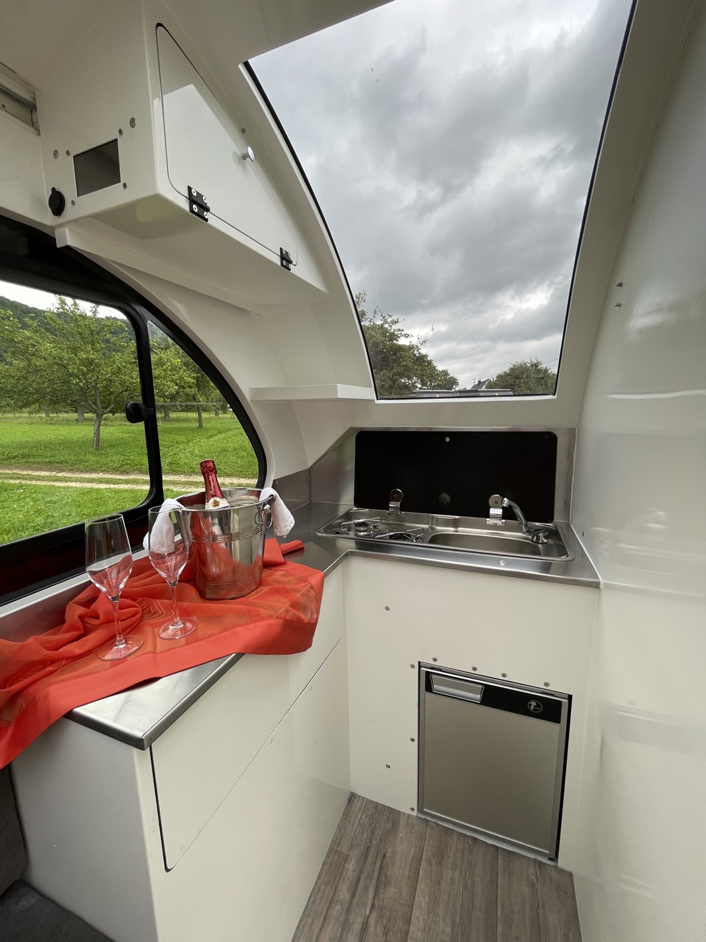 Er verfügt über einen Slide-Out direkt über der Heckklappe. So wird aus dem kompakten Teardrop fast ein vollwertiger Caravan für eine vierköpfige Familie. Im ausgefahrenen Zustand bietet der Raptor XC Platz für ein Hauptschlafzimmer, eine Innenküche, ein Bad sowie einen Essbereich.