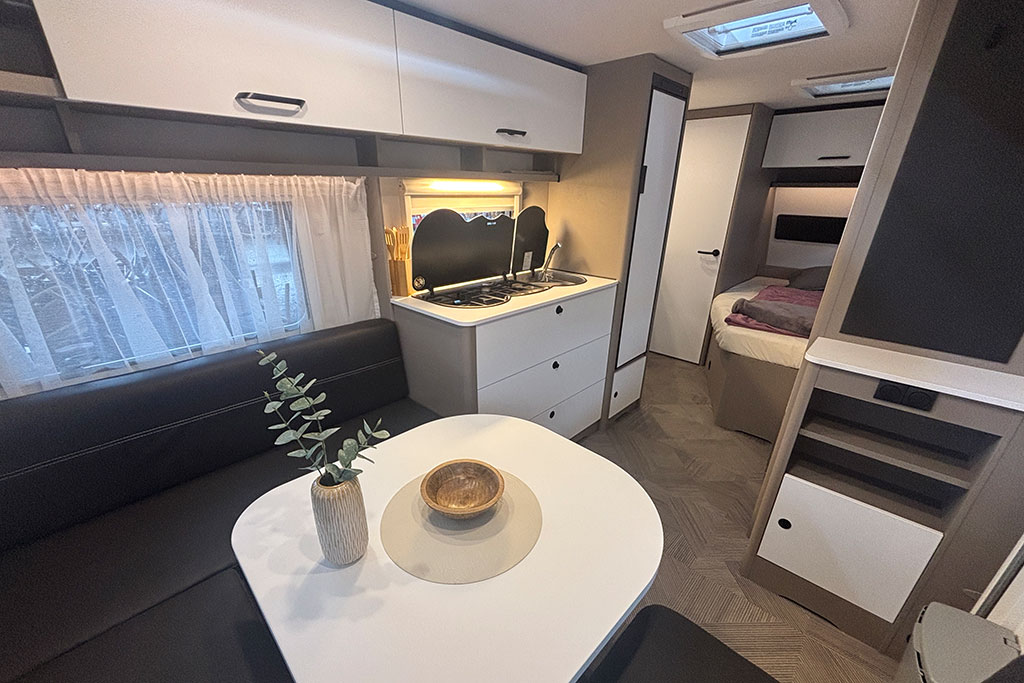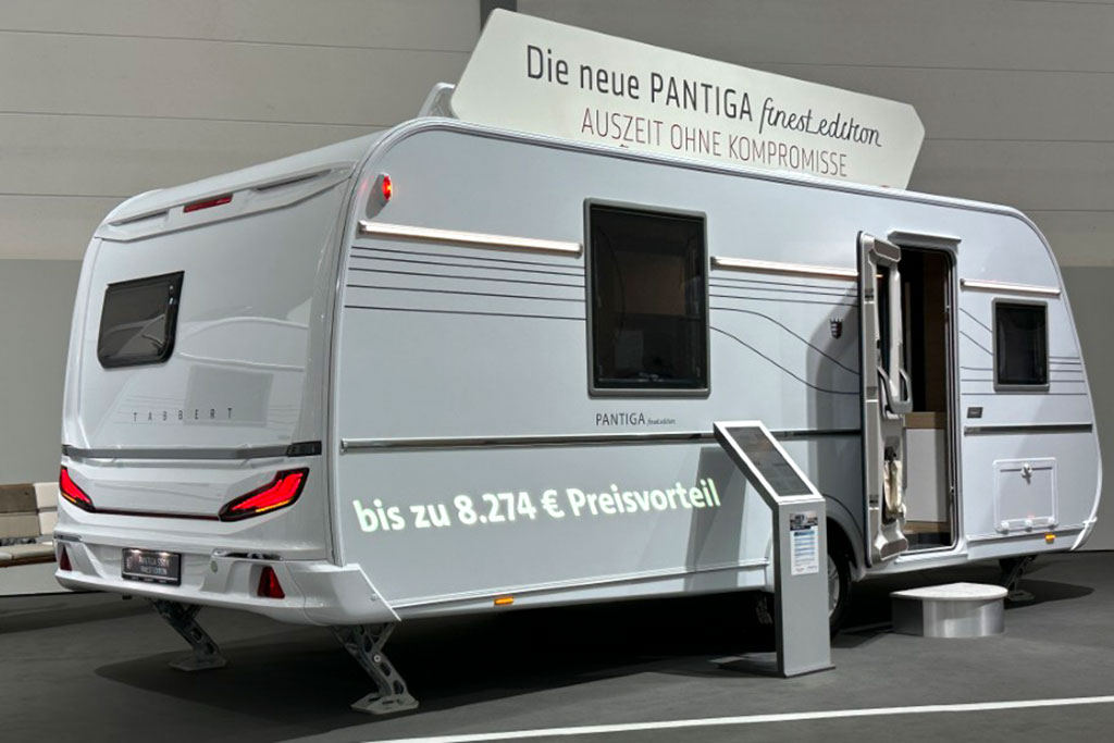 Mit der Finest Edition hebt Tabbert seinen Pantiga auf Premium‑Niveau: Rahmenfenster, beleuchtete Markisenleisten, Premium-Tür, Lichtkonzept außen/innen, ATC‑Schleuder‑System, Big‑Foot‑Stützen, Außendose TV/230 V. Innen: WaterGel‑Matratze, drei‑Flammen‑Gaskocher, Ambientebeleuchtung, Insektenschutz. In sechs Grundrissen ab 27.730 Euro, also rund 15 % günstiger als zuvor.