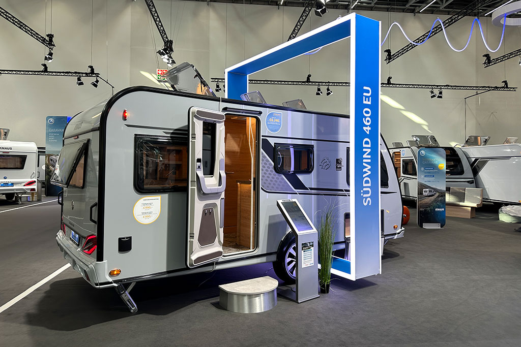 Die Black Selection setzt den Knaus Südwind als edles Editionsmodell in Szene: Campovolo-Grau, schwarze Zierleisten, anthrazitfarbene Details. Innen: helles Dekor, LED‑Beleuchtung, neue Grundrisse (580 UF, 650 UK, 650 UDF), Bluetooth-Soundsystem, Ambientebeleuchtung, TV‑ Vorbereitung und Rollbettfunktion. Der Klassiker startet ab 26.990 Euro und der Kunde spart bis zu 7.281 € gegenüber den Einzeloptionen.